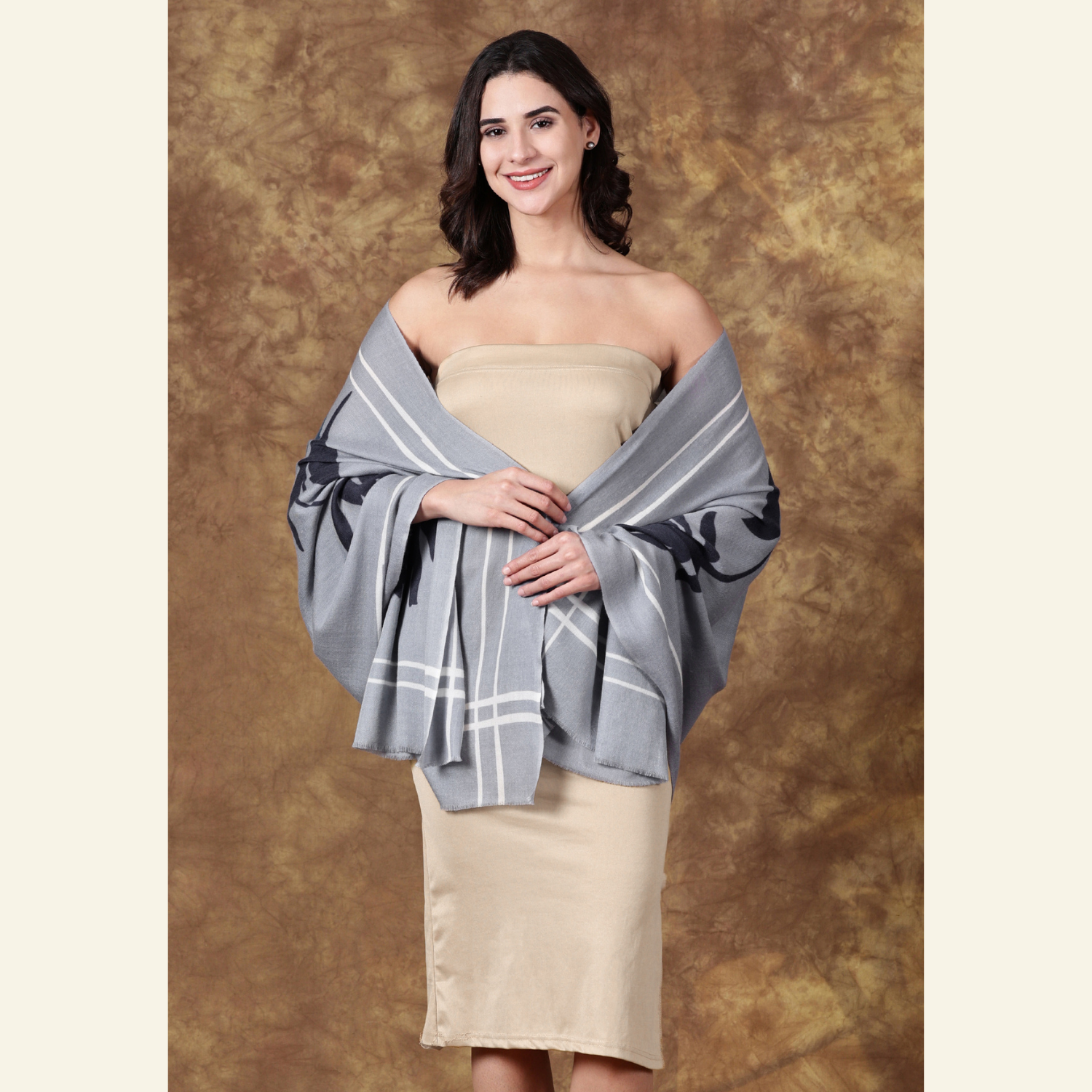 Luxurious wool-silk scarf with hand-painted artisan craftsmanship. The scarf has a modern silver-grey base colour, enhanced by a contemporary floral design in rich midnight blue and charcoal tones. The refined palette makes this scarf a timeless and versatile accessory, perfect for both casual and formal outfits.